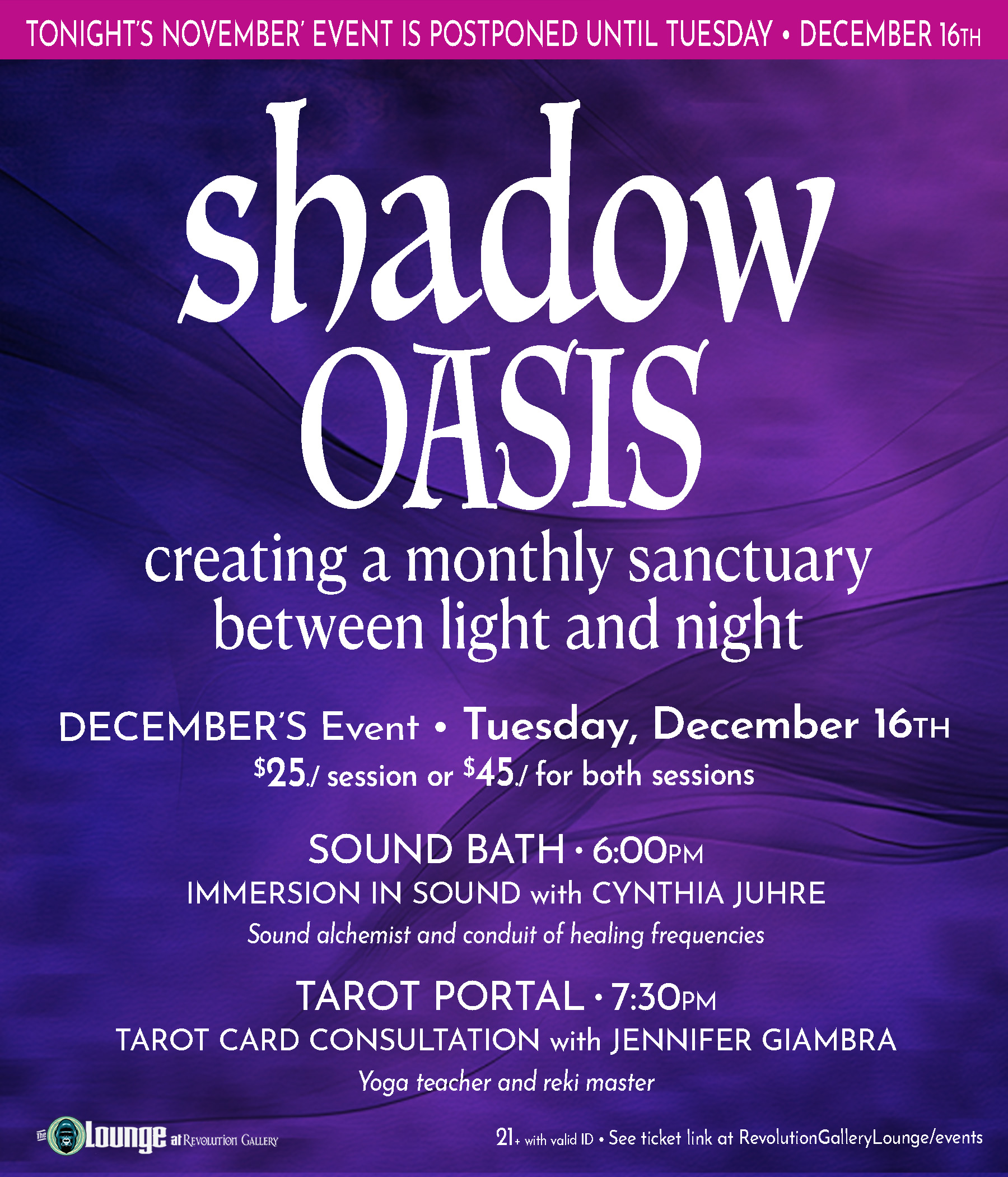 Shadow Oasis • DECEMBER‘S Event • Tuesday, December 16th • $25./ session or $45./ for both sessions